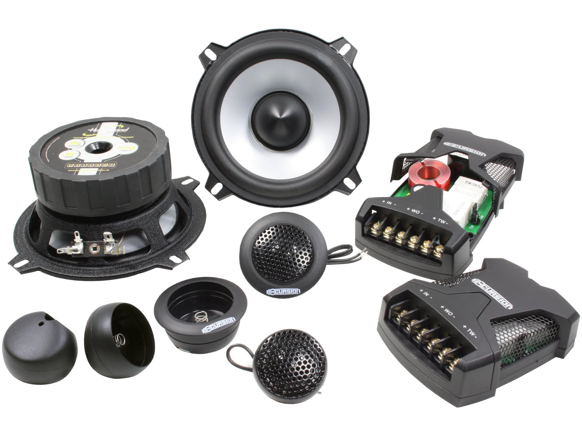 High Power Excursion Components include 25mm Silk Softdome Tweeter, silver Mica-Polypropylen cone, rubber surrounds, X-Max Spiders, Excursion rubber magnet rear cover, Pole piece and Dust cap air cooling ventilation, high temperature/handling Voice Coil, noise free DIN baskets, 12dB/Oct. EU designed passiv X-over with PTC security and +/- 3dB Tweeter volume adjustments. Installation hardware.